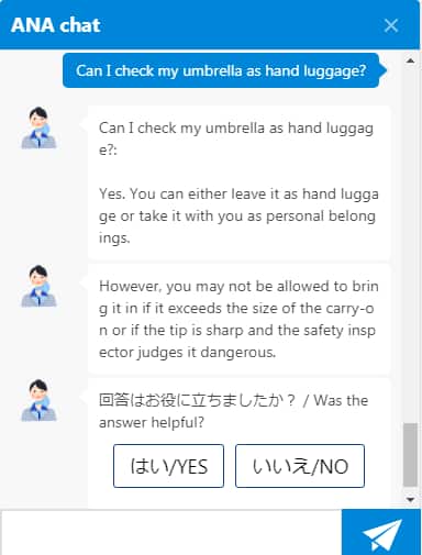 If you use ANA Chatbot during our telephone operator hours but do not find the helpful response provided via this function, a questionnaire for your inquiry category will be displayed.
