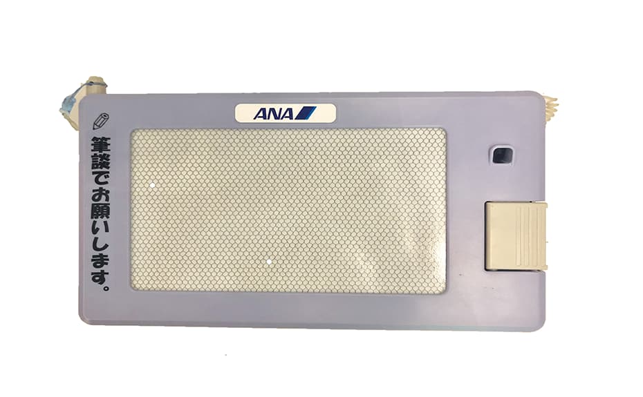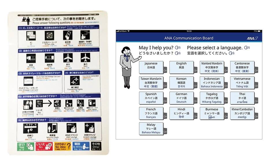 In order to facilitate smooth communication with deaf and speech-impaired customers, and foreign customers, we have installed a writing board and a communication board at the counters at airports in Japan. There are two types of communication boards, a paper version and an electronic version. The paper version is written in 4 languages, Japanese, English, Chinese, and Korean, and the electronic version is written in 17 languages *.