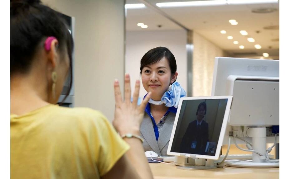 Remote Sign Language Communication: Using a designated tablet device, the operator simultaneously interprets the communication between the customer and the airport staff in sign language and speech.