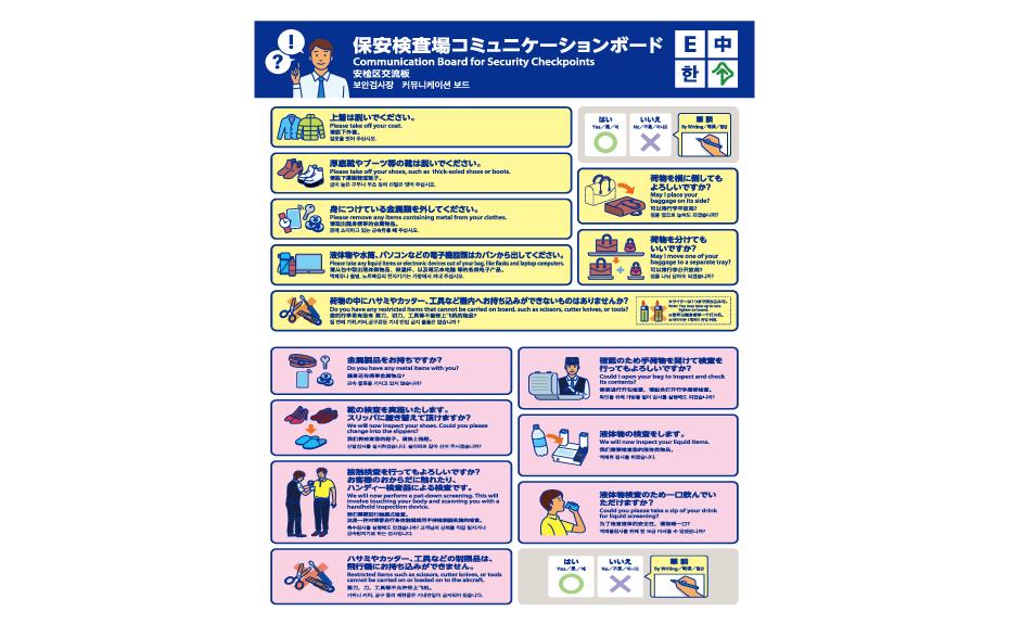 Passengers with hearing disabilities and foreign nationals can use the boards while pointing at each other to facilitate the security check.