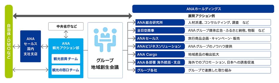自治体・DMOなどはANAホールディングス、ANAセールス国内支社支店、ANA観光アクション部と連携。ANAセールス国内支社支店はANA観光アクション部と連携。観光振興チームと観光の窓口チームから成るANA観光アクション部は中央省庁などと連携、またグループ地域創生会議を通じて、次のような展開アクションを行う。ANA総合研究所は、人材派遣、コンサルティング、調査など。全日空商事はANAグループ媒体広告・ふるさと納税、物販など。ANAセールスは旅行商品企画・キャンペーン・販売。ANAビジネスソリューションはANAグループのノウハウ提供。ANA Cargoは地域産品の輸出拡大。ANA各部署 海外統括・支店は海外でのプロモーション、日本への誘客促進。グループ各社はグループで連携した取り組み。