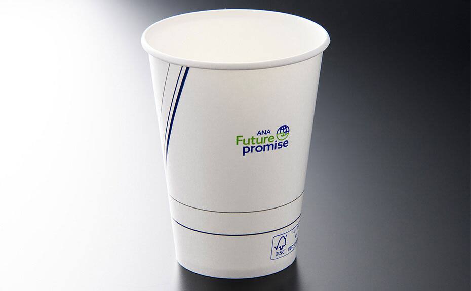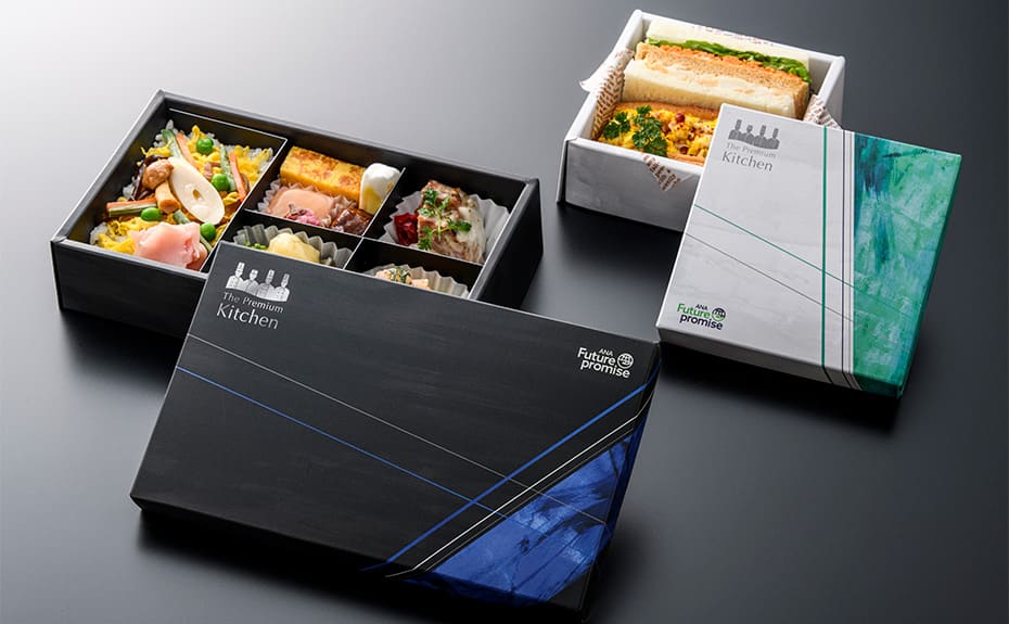 ANA Future Promiseの一環として、プレミアムクラスのお食事では、再利用可能な食器、使い捨ての容器やアイテムに関しては環境に配慮した素材で出来た製品を使用しています。