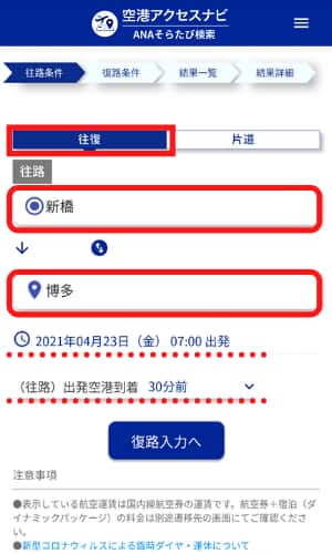 空港アクセスナビの条件入力画面が開きます。
