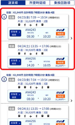 条件に合う経路が最大5件、ANA便の空席状況・運賃情報とともに旅程全体の金額が安い順に表示されます。経路は所要時間順、乗換回数順に並び替えも可能です。ご利用になる経路を選択してください。